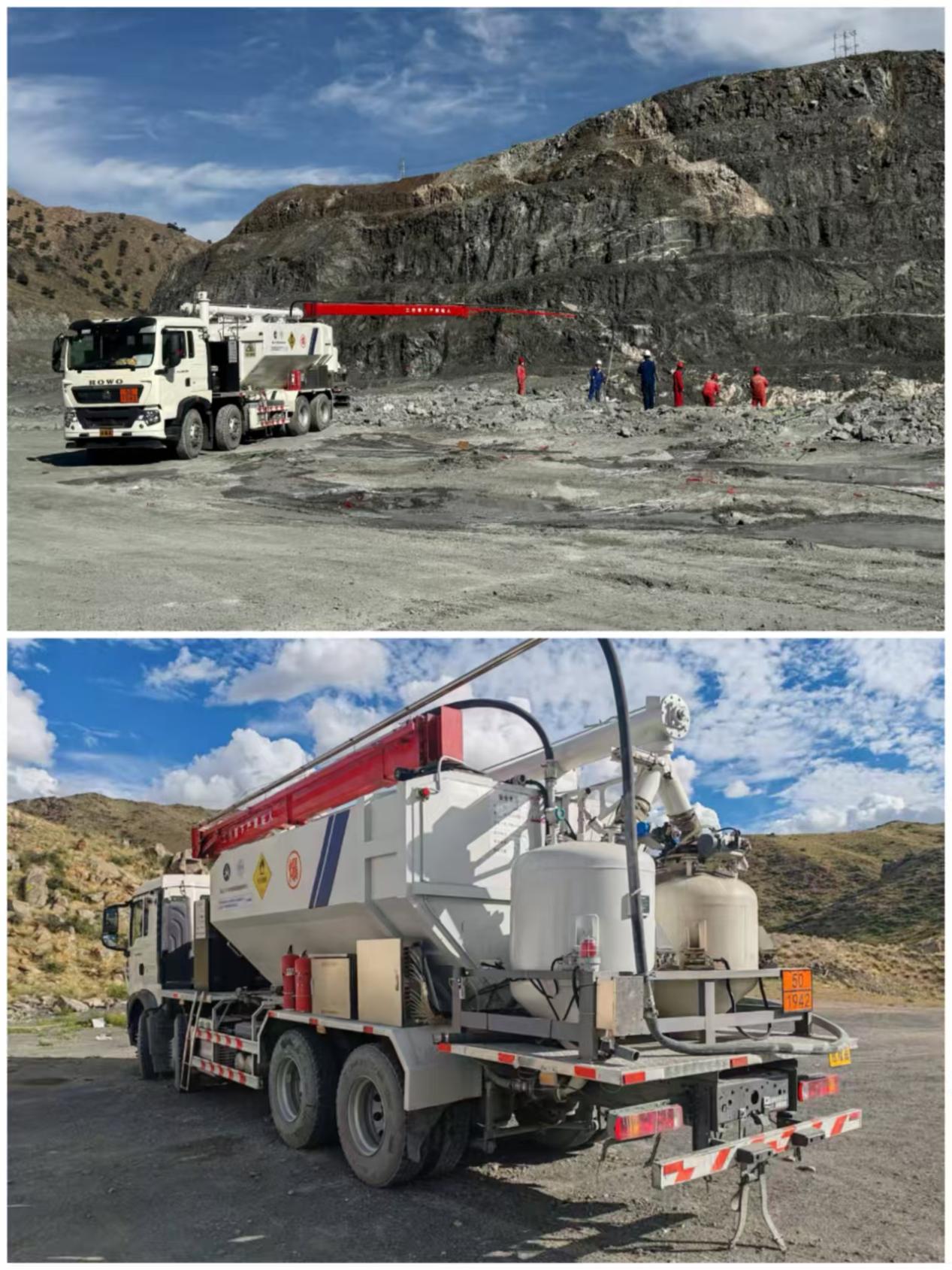 BCJ-Q(Ⅱ)型混装车是在第一代BCJ-Q型基础上进行技术升级的第二代产品。第一代产品已于2022年12月通过工信部科技成果鉴定,并在内蒙古、河北、湖北、海南等多地的露天及地下矿山成功应用。其采用的气力输送装药技术,突破了传统螺旋装药模式,扩大了机械化装药范围,并通过发送罐称重计量技术有效提升了计量精度。